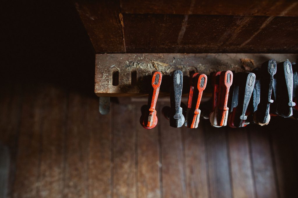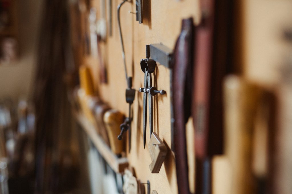 En effet, nous avons la chance de disposer d’un atelier capable d’accueillir non seulement tous nos outils, des plus communs au travail du bois (rabots, ciseaux à bois, gouges…) aux plus spécifiques à notre beau métier (pointes aux âmes, louces, et presses en tout genre…), mais aussi un stock de bois important de diverses provenances et époques. Il nous est indispensable afin de correspondre le plus possible au bois d’origine de l’instrument lors de restaurations.